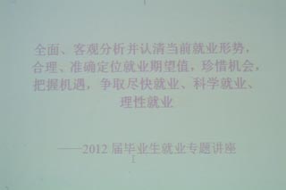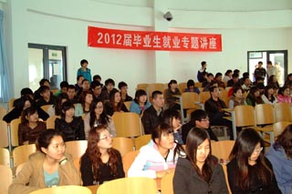 2012年3月20日下午,学院在交通楼J311教室举办《全面、客观分析并认清当前就业形势,合理、准确定位就业期望值,珍惜机会,把握机遇,争取尽快就业、科学就业、理性就业》的专题讲座。学院各系学工办主任(团总支书记),2012届毕业班全体班主任以及2012届未就业毕业生共300余人听取了讲座。