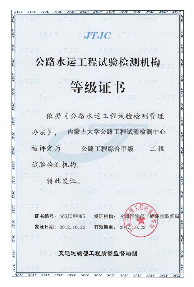 10月23日,交通运输部工程质量监督局正式向内蒙古大学公路工程试验检测中心颁发了“公路工程综合甲级”资质证书。内蒙古大学公路工程检测中心成为自治区第一家公路工程综合甲级检测机构,从而填补了自治区交通行业综合甲级检测机构的空白。试验检测中心获得综合甲级资质,是内蒙古大学交通学院实验室建设的一项标志性成果,将为学院教学、科研、技术服务提供良好平台,为密切与交通行业企业的合作创造便利条件,也为学院师生创新发展提供难得机遇。